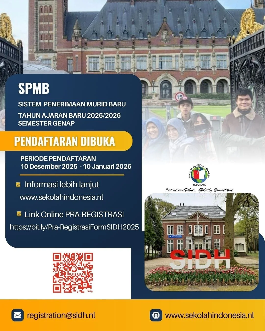 Sekolah Indonesia Den Haag (SIDH) yang diselenggarakan Kementerian Pendidikan Dasar dan Menengah mengundang Putra-Putri Indonesia yang sedang berada di Eropa dan Afrika untuk menjadi siswa SIDH melalui program tatap muka atau pembelajaran jarak jauh. SIDH hadir di Belanda untuk menyedikan layanan pendidikan dengan sistem dan kurikulum nasional serta mengedepankan nilai-nilai kebangsaan Indonesia yang dikemas dalam nuansa, pengalaman pembelajaran, dan interaksi dengan lingkungan global. Mari bergabung dan mendapatkan pendidikan terbaik dengan kualitas global yang berakar pada nilai luhur Indonesia